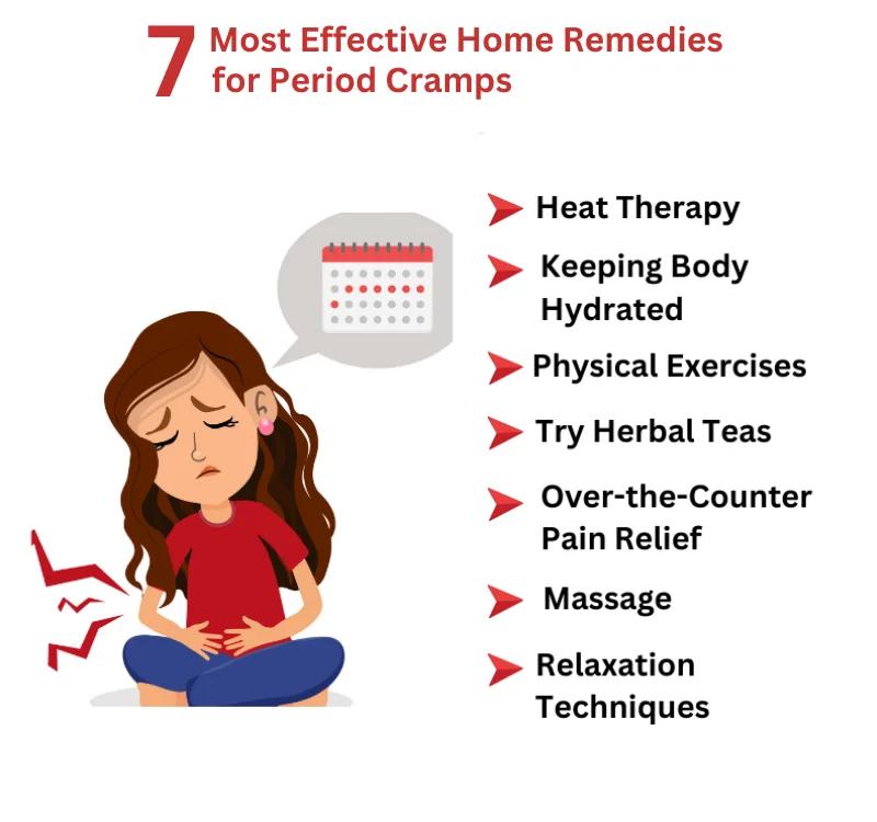 Some home remedies which include ginger, turmeric, and cumin, can relieve cramps. Heat therapy, mild exercises, and herbal teas are also efficient.