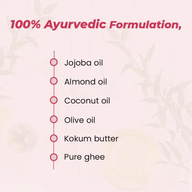 Jojoba Oil, Almond oil, Kokum Butter + other ayurvedic herbs